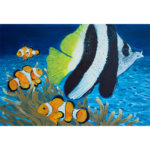 The ocean is teeming with life and diving in tropical waters is an unforgettable experience. The desire to reproduce images and underwater impressions drove me to create this painting. The painting changes colour through lighting, imitating the marine atmosphere, and giving the impression of movement. Painted with oil on Plexiglass and illuminated with LED lights, these paintings give the room a calm atmosphere in different colours. As the energy-saving lights run with battery, they can be easily placed anywhere you desire.